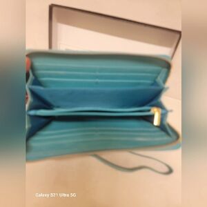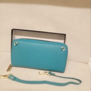 New in the Box - Sandra Brown 8-1/2" teal leather wallet. The wallet has a detachable strap to create a mini bag. Please see all pictures.