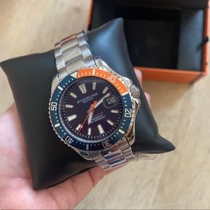 Uni-directional rotating (120 click) stainless steel bezel with a blue and orange ring.