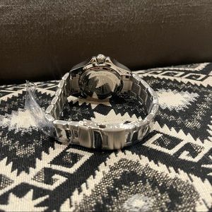Stainless steel case with a stainless steel bracelet.