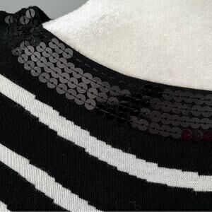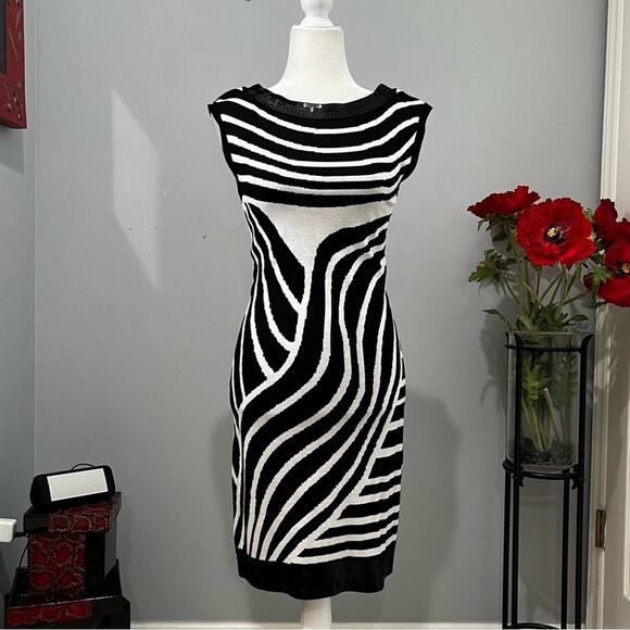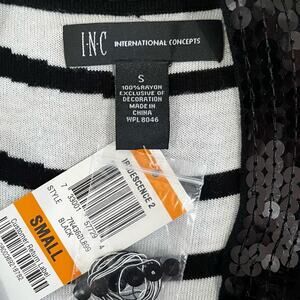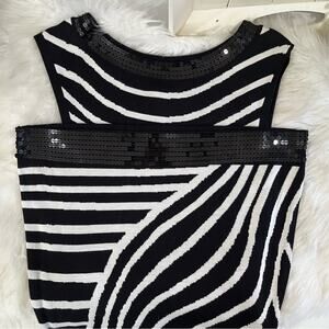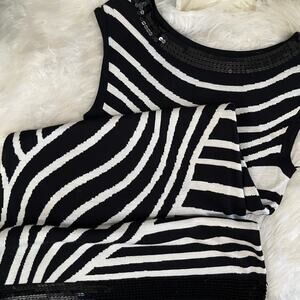New with tags Stunning INC International Concepts Iridescence Sequined Trim Variant Wavy Striped Two-Tone Contrast Black and White Knit Sleeveless Bateau Wide Neck Dress. Figure Flattering Fitted Style. Lightweight Knit. Flat and Shimmer Black Iridescent Sequins. Women’s Size Small.