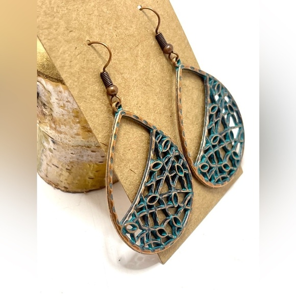 Gorgeous boho simple teardrop ldangle earring with turquoise patina finish.