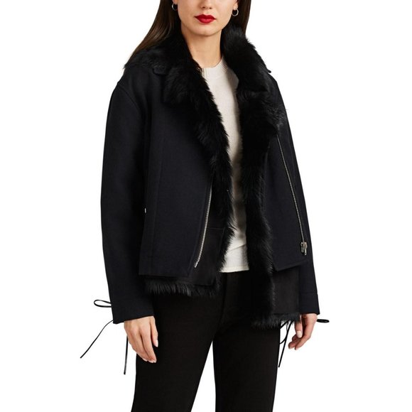 Removable sleeveless shearling vest gives this classic jacket a luxurious update. Wear separately or layer for a chic style. Front zip closure. Sleeves with lace-up cuffs. Two snap-flap front pockets. Concealed hook-and-eye closure on vest.