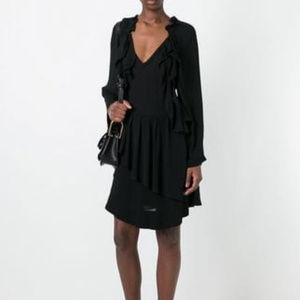 New with Tags IRO Salene Ruffle-Trim Mini Dress, BLACK Size 38 Tie-front V neckline. Long sleeves. Seamed waist. A-line silhouette. Draped overlap front. Arched hem. Pullover style.