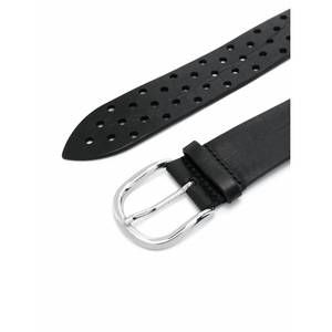 Statement accessory in black belt. Features 100% cow leather with chrome hardware. Including an adjustable metal buckle and a leather loop with silver-finish metal details for added edge. Made in Italy. Perfectly complements a chic wardrobe with its signature perforated design.