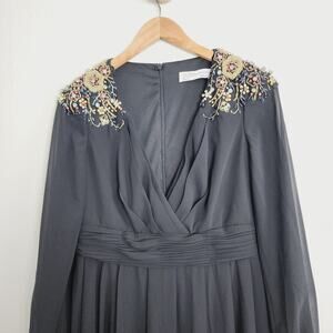 Long chiffon faux wrap A-line dress with empire waist, v-neckline and embellished shoulders.