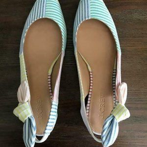 Per J.Crew, "Bow-embellished slingback straps add a touch of glamour to this vintage-look (and supercomfy) low heel. Our patchwork seersucker print makes the ultimate spring statement. Heel height: 40mm."