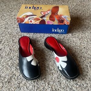NEW! Indigo Black and Red Mules with Sleek Floral Design
