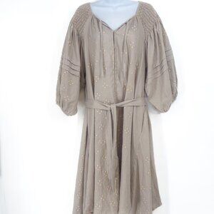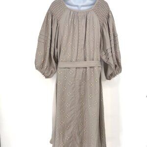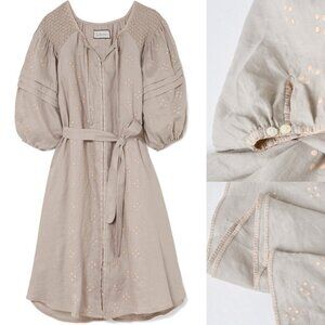 NEW Innika Choo Hugh Jesmok Smocked Linen Midi Dress Embroidered Dot Grey Size 1