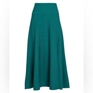 Cut for a subtle A-line silhouette, our Ziggy midi skirt is finished with a sleek slit hem in soft peacock green knit. Elasticized waistband. Pull-on style.