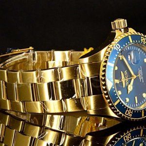 Dive into innovative style and function! This decidedly sophisticated Pro Diver from Invicta features a mid size case with a blue dial and bezel. Luminous hands and hour markers keep you on time anytime, while a date window at 3:00 helps you sort your schedule. The gold-tone finish on the stainless steel case and bracelet brings a refined element that's perfect for the office or special occasions.