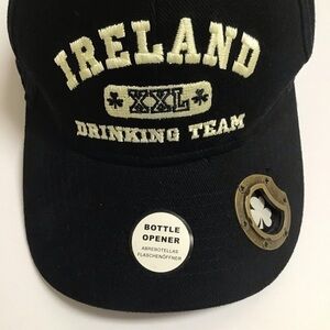 NEW - Ireland XXL Drinking Team Black Strapback Cap Bottle Opener 100% Cotton Hat. Bottle opener on bill. Adjustable hook and loop backstrap. Nice hat; quality made by Traditional Craftwear.
