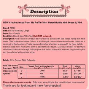 Add easy-breezy style to your casual closet with this tiered ruffle trim midi dress. This boho style dress falls to a midi length that can be dressed up or down. Features an adjustable shoulder straps with tie front detail. Crochet lace inset with ruffle trim to add feminine touch. Elasticized waist for comfy fit and lined skirt for coverage. Simply pair this tiered dress with sandals for polished yet carefree style.