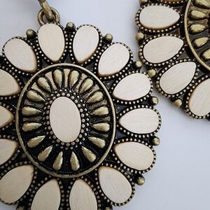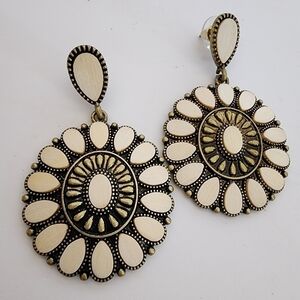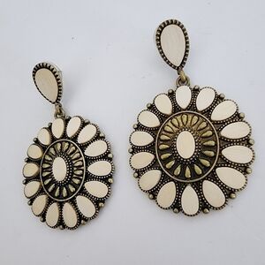 Beautiful and unique ivory wood and antique gold round dangle earrings. Western design details.