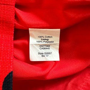 60s inspired gorgeous red dress with navy blue polka dots. This is the perfect dress to wear to work, summer party, or a fun night out. Dress is 100% cotton, the liner is 100% polyester. Dry clean only.