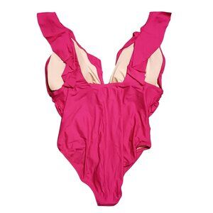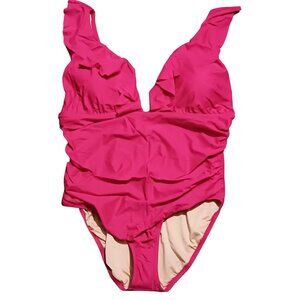 Keywords: j crew swimsuit, pink swimsuit, ruffled one-piece, ruched swimsuit, v-neck swimsuit, women's swimwear, nylon blend swimwear, size 22 swimwear, elegant swimwear, designer swimwear, fuchsia swimsuit, summer swimwear, flattering one-piece, Barbi swimsuit, Neon pick swimsuit, Pink bathing suit, jcrew swimsuit, plus size swimsuit