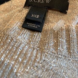 very light thin knit sweater top in a pretty tan /gold with subtle metallic shimmer (appears as tan/gold with silver sparkle) — this is so versatile & easy to dress up/down by color you pair to. my fav is blue jeans, dark or light wash, black pants or skirt for dressier look, brown for more toned down casual, love it with burgandy, tan, khaki & navy blue!