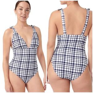 NEW J. Crew Tie-shoulder One-piece Swimsuit Navy White Marine Plaid Seersucker 6