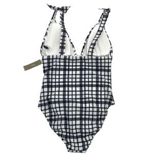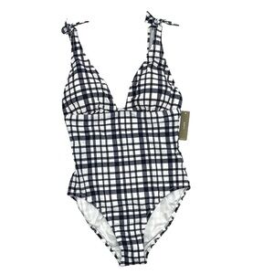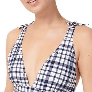 New with tags! J. Crew tie-shoulder one-piece swimsuit in marine plaid (navy blue and white). Textured fabric like seersucker.