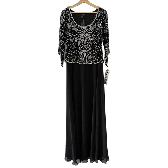 J Kara Round Neck 3/4 Sleeve Beaded Bodice Formal Dress Long Chiffon Gown Black