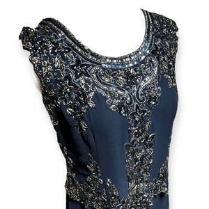 NEW J Kara Navy Mock 2 Piece Beaded Bodice Cap Sleeve Long Fit & Flare Dress