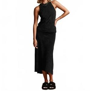 Introducing the Velvet Midi Skirt by JAMES PERSE, a chic minimalist addition to your summer travel wardrobe. This solid black skirt offers a smooth, luxurious texture, perfect for effortless, sophisticated styling without pockets. Care instructions recommend dry cleaning to maintain its pristine condition. Designed with a focus on quality and style, this piece delivers elegance with every wear.