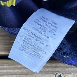 Navy blue popover with feminine lace inserts and a metallic gold & neon yellow clip dot pattern. Style# K5264