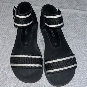 A NEW PAIR OF JEFFREY CAMPBELL WOMENS 7 GAME TIME BLACK AND WHITE SANDALS