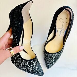 NEW JESSICA SIMPSON Black Silver Crystal Wayva Pointy Toe Stiletto Pumps Heels 8