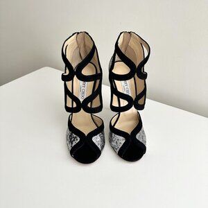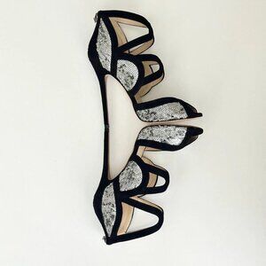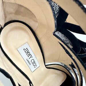 NEW JIMMY CHOO Tempest Black Suede Silver Sequin Cutout Heels Sandals Size 38