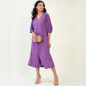 quiet luxury summer dress coastal chic elevated basics balloon sleeve trend button midi relaxed resort wear everyday effortless purple tones natural fabric breathable fit soft tailoring coastal cowgirl european summer capsule wardrobe viscose blend breezy fabric timeless silhouette brunch outfit petites fashion current season boutique