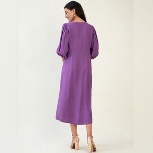 Brand new with tags. Effortless and elegant, this deep royal purple midi dress from J.Jill is made from a breezy linen-rayon blend for a lightweight, breathable fit. Features a relaxed pullover design, V-neckline, side slits, button-down front, and voluminous balloon sleeves for modern sophistication. A perfect piece for work, weekend, or vacation styling.