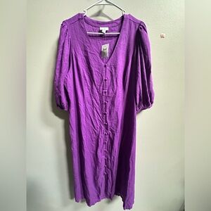 NEW J.Jill Linen Blend Balloon Sleeve Button Front Purple Midi Dress Women’s LP