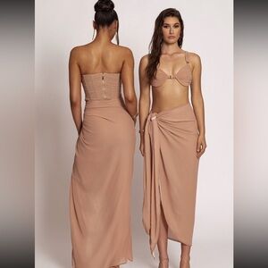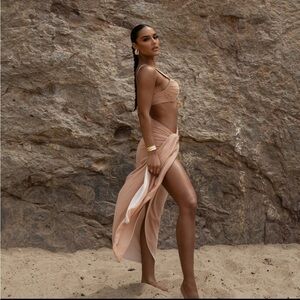 Our Tan High Tides Bikini Top is the essential of the season. Crafted in sheer mesh fabric, this gorgeous bikini top features wired cups with padding, adjustable shoulder straps, and is adorned with an elegant gold-tone clasp closure at the center bust. Complete with lined interior and adjustable hook and eye back closures. Pair with a tan uncharted waters sarong for the full look. (On my page)