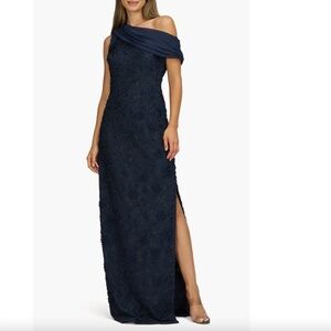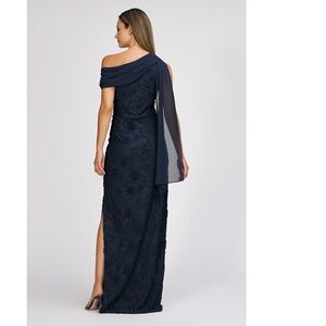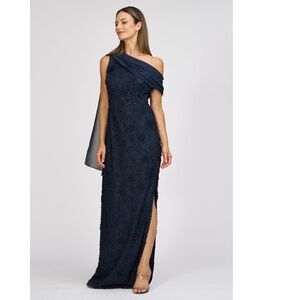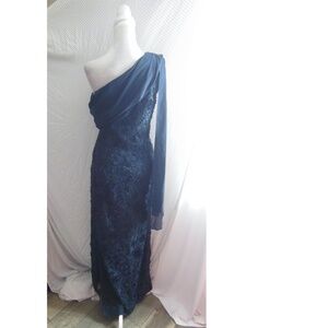 NEW JS COLLECTIONS Navy Lace ELODIE Floral ONE SHOULDER Chiffon DRAPED GOWN 10