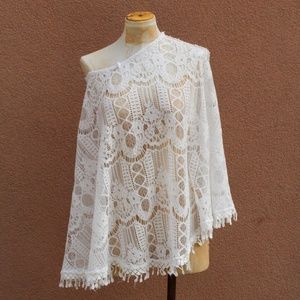 This gorgeous white lace capelet with a delicate crochet fringe has more of a modern edge. Use as a cover-up on a cool evening, the pool, honeymoon or bachelorette party. A perfect gift for the bridal shower.