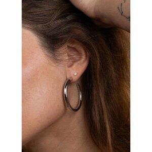 New Jax Kelly Everyday Hoops are sleek silver hoop earrings deliver understated elegance with their substantial width and polished metallic finish. Designed for versatile wear, these hoops transition seamlessly from professional environments to evening settings.