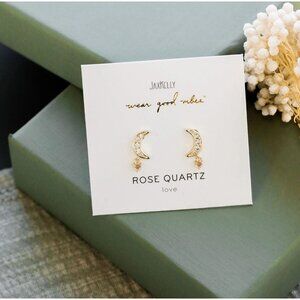 The JaxKelly Wear Good Vibes earrings feature a gold-tone crescent moon design, adorned with cubic zirconia accents. A rose quartz gemstone dangles from each stud, known for amplifying the essence of love and opening the heart. They are tarnish-free, promising long-lasting wear and a touch of elegance to any attire.