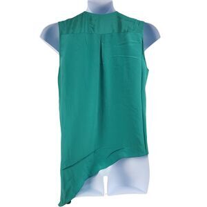An all silk sleeveless blouse by Jay Godfrey. It is green, button-down, and has an asymmetrical hemline that is longer on one side. These types of blouses are versatile and suitable for various occasions, from nights out to professional settings when paired with a blazer.