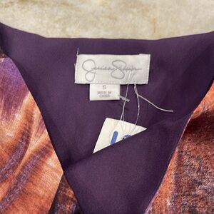 Feminine and flirty 💜✨ This Jessica Simpson baby doll dress features a beautiful tonal purple and gold pattern, cap sleeves, and a flattering A-line silhouette that hits above the knee. 100% Polyester. Fully lined for comfort and elegance. Brand new with tags — perfect for parties, date nights, or special occasions!