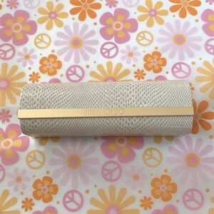 Jimmy Choo cream colored faux snakeskin textured eyeglasses case with magnetic closure and gold tone trim, and a branded soft cleaning cloth. Elegant design with white interior. Nice and lightweight so it won’t add a lot of weight to your bag. Very nice! 🌸✨