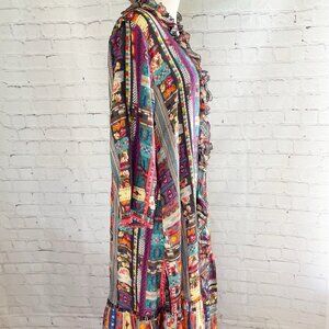 Tiered maxi shirt dress in mixed geometric and floral prints features ruffled trim at v-neckline and button up front.