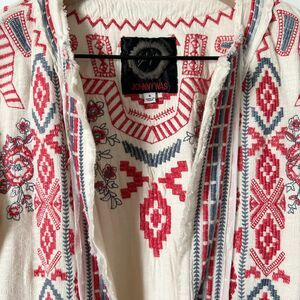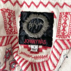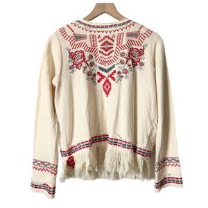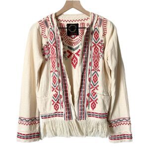 Johnny Was Biya Yatzil Embroidered Fringe Jacket in Cream, Red & Gray details. 100% Cotton. New without tags. Light mark on right side chest. Size Small.