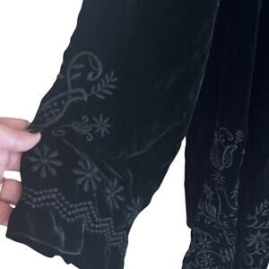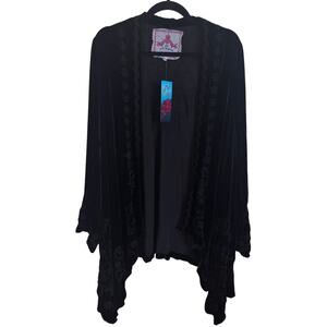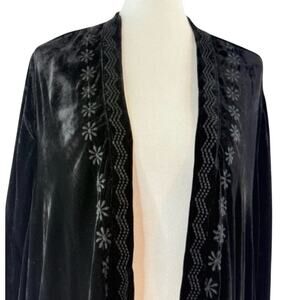 A gorgeous black velvet floral embroidered Kimono/Draped Cardigan by Johnny Was. Tone on Tone black velvet with black embroidery. New with tags. Size 2X. Rayon/Polyester.