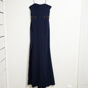 Strapless midnight blue bustier gown with built-in hook-and-eye corset, cutout waist with grommet chain-link metal detail, trumpet silhouette skirt with slits. Thick double crepe fabric.