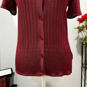 New without tags Beautiful Longline Semi Sheer Rayon Ribbed Knit Lightweight V-Neck Button Front Short Sleeve Casual Sweater Top by Jones & Co. by Jones New York. Vivid Ripe Cranberry Red. Women’s Size Small.