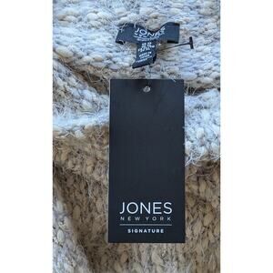 New with tags Jones New York Signature cozy oversized boucle knit sweater in Silver Combo (gray & white). It is constructed of a soft, fuzzy textured yarn with subtle heathered tones. Relaxed tunic length with a slouchy mock turtleneck, drop shoulders, and long sleeves for easy layering. Comfortable medium weight knit ideal for cool weather and casual outfits. Approximate measurements are below. 2 day shipping!