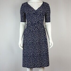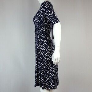 NEW Jones Wear navy blue and white polkadot knee-length dress. Has 3/4 sleeves, wrapped bodice with ruching on left side, and attached belt.