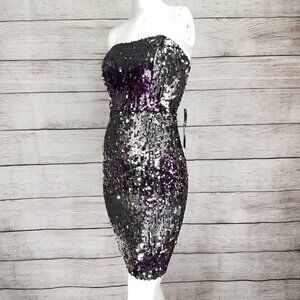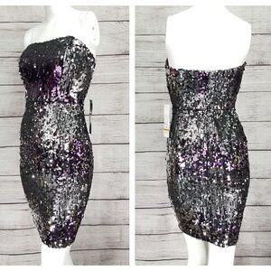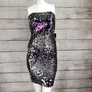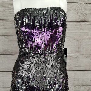 Ombré purple sequins with silver and black, strapless style, mini length.
