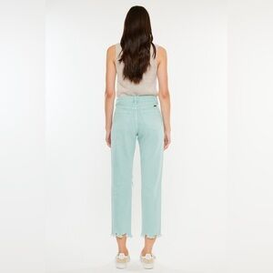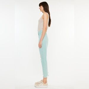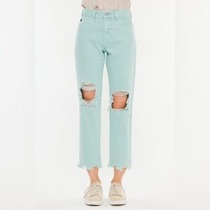 Our Ariel High Rise Jeans is an eye-catching mom fit cut in a beautiful seafoam color. Detailed with frayed hems, five-pocket design, and knee fabric rips to bolden your outfit. Sits above the natural waistline as it relaxes down the leg giving you a comfortable fit.