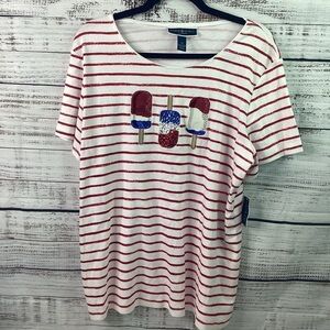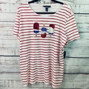 Karen Scott Brand, New, size x , short sleeves, red stripes, embellished , perfect for 4th of July day, new with tags.